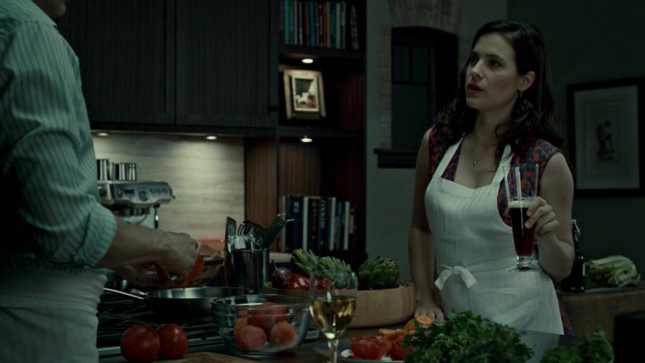And to prove it, Hannibal begins pulling at the strands which bond Alana and Will, inviting Alana over while he's preparing for dinner to, essentially, being courting her. She's clearly always had at least an admiration for him, and now he's just shy of lovebombing her, revealing that he's brewed her a private stock of beer and asking her why they didn't sleep together when she was a grad student and he was her advisor. We're naturally inclined to believe it's devious on Hannibal's part, because we've seen how he operates, but the way Mikkelsen and Dhavernas play the scene also conveys genuine chemistry, second only to Mikkelsen's chemistry with Dancy as Will. Hannibal is a show designed to constantly pull you in more than one emotional direction, and to do it so effectively that you won't realize you're rooting for a monster until it's too late. This is yet another brilliant piece of that expanding puzzle.