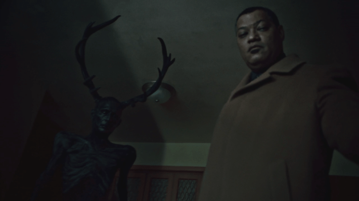 The Season 1 finale wastes no time in getting to the good stuff, as we open on Will in the forest, stalking a stag with a hunting rifle, just like Garrett Jacob Hobbs would have when he was alive. But of course, Will's a fisherman, not a hunter, our first clue that we're in some kind of vision or dream world. Will is stalking a stag, and even gets off a shot that wings the animal, but as he gets closer we realize it's not just a stag, but the Stag, the avatar of his nightmares following him ever since he shot Hobbs dead in the series premiere.