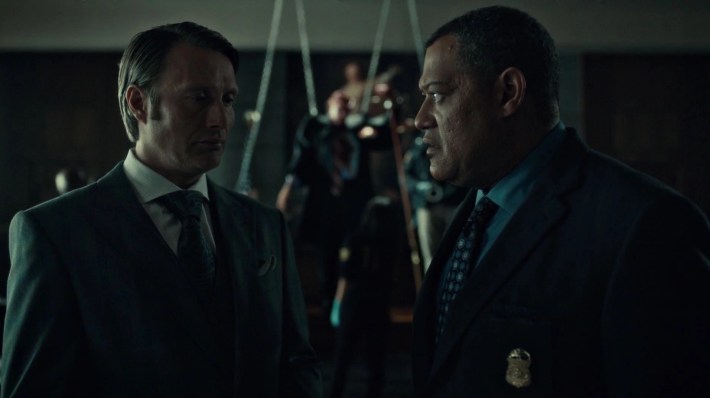 One of the first things "Hassun" shows us is a montage of Will and Hannibal getting dressed, each putting on their courtroom suits under very different circumstances. Will's having visions of himself flipping the switch on an electric chair, carrying out his own execution, while Hannibal's got…other plans.