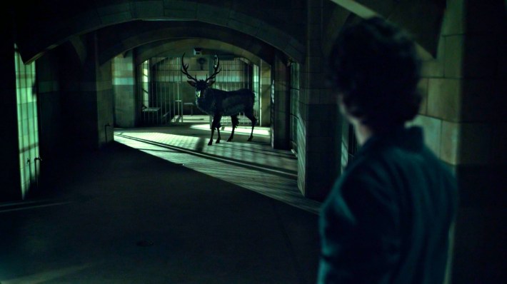 But despite Hannibal's earnestness and silky smooth demeanor, Vega sees right through it, pointing out the discrepancies in the bailiff's murder until the judge rules the defense inadmissible, tanking Will's chances of using another killer to free himself. The next morning, a janitor finds the judge's corpse, strung up over his bench in the courtroom, suspended by chains to look like blind justice, his brain scooped out of his head. A mistrial is now automatic, and while that doesn't mean Will's going to walk free, it does mean his fate is at the very least postponed by this escalation from a killer who, quite clearly, loves him. Back in his cell, Will is once again stalked by the Stag.