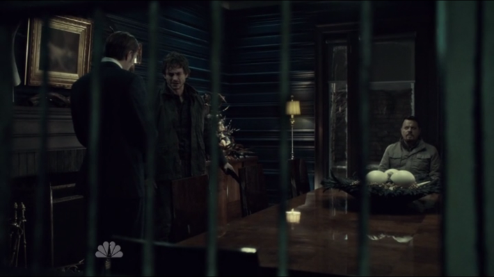 While Hannibal lays down his own bait, Chilton goes fishing in Will's mind, giving him a "narcoanalytic" interview that'll hopefully help him to answer truthfully, and even dredge up things he's not willing to admit to himself. Will, of course, consents to this, because he hopes that the drugs will help dig up details of Hannibal's crimes, and it turns out he's not wrong. While Chilton drones on with his question, Will goes somewhere else, back to that fateful night when he stood in Hannibal's dining room and had a seizure while Hannibal and Dr. Abel Gideon (Suzy Eddie Izzard) discussed the Chesapeake Ripper. He remembers the entire conversation for the first time, and he also remembers a light, flashing at intervals in Hannibal's library, inducing his seizures, forcing him into periods of lost time and memories. When Chilton learns of this, he confronts Hannibal about his unorthodox methods, which they'd previously discussed, and cuts off Hannibal's contact with Will. He gets a predictably icy response from Lecter, which is our first sign in a while that Will might finally be gaining ground in this fight.