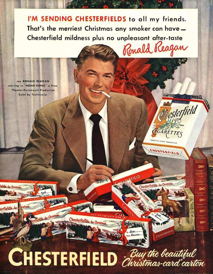 Ronald Reagan doesn't get talked about enough, which is a shame because he was an awful person and an even worse politician. And hey, here he is in a Christmas ad, sending cartons of Chesterfield cigarettes to his friends, once again turning a blind eye to another national health crisis.