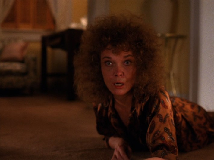And Sarah Palmer slides down the stairs of her home on her belly, hand extended, clutching the carpeted steps like a revenant. She seems to have been drugged. She calls her husband’s name. She makes it down to the living room.